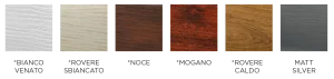 Colorazioni disponibili: Bianco (verniciabile), Bianco Venato, Rovere Sbiancato, Noce, Mogano, Rovere Caldo, Matt Silver